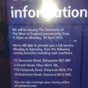 On the 6th of february 2012 the uwe frenchay branch of natwest put a sign in the window notifying customers that the branch would be shut down on monday 30th of april 2012. UWESU mobilised immediately and within the first hour had over 250 students on facebook in support of the campaign to keep the bank open and cash points on campus . Contact was made with university management who have notified us that they have only found out in the last few days and the complaints/ head office team for natwest (rbs) who could not provide us with any further information at that time but promised to get back to us. In addition we have contacted the student union newspaper the western eye and bristol news who are both keen on running stories. Many students have expressed their concerns. at a time when students’ are facing increasing fees, raises in accomodation costs and travel in addition to the problems with student loans being paid late; it has never been more important to have access to a bank. Within the first 10 minutes of hearing this news i was contacted by a disabled student who expressed concerns around access. Withdrawing the branch from uwe frenchay will have a detremental effect on 1000s of students’ and staff at uwe and ulitmately affect the educational experience of students’ studying at uwe. Please sign the petition and show your support.